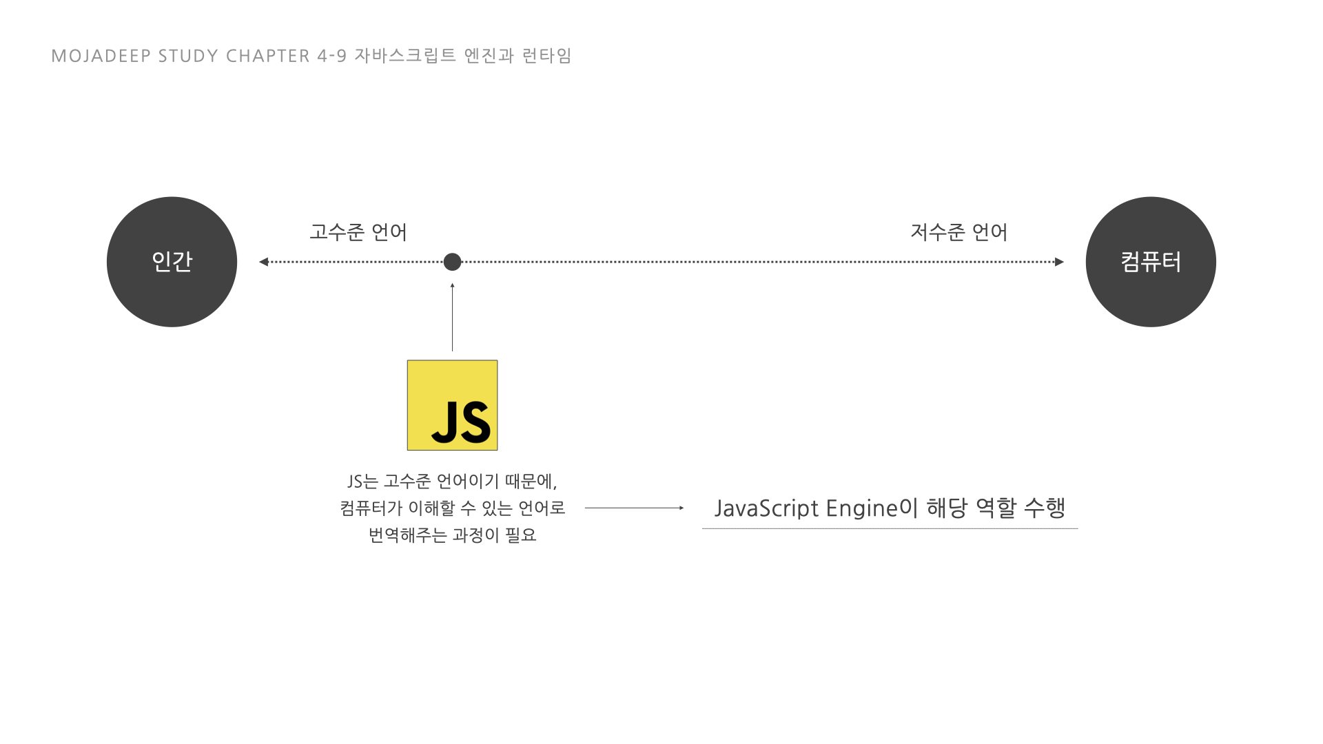 프로그래밍 언어는 사용 목적에 따라 컴파일 또는 인터프리터 중 하나의 방식으로 프로그래밍 언어를 컴퓨터가 이해 가능한 바이너리 코드로 변환한다. 그리고, 이렇게 코드를 변환하고 실행하는 과정을 관리하기 위한 별도의 프로그램이 필요하고, 자바스크립트는 자바스크립트 엔진이 그 역할을 수행해 준다. 즉, 자바스크립트 엔진은 자바스크립트로 작성된 코드를 컴퓨터가 이해할 수 있는 바이너리 코드로 변환해서 컴퓨터에게 명령을 실행시키는 도구인 것이다.