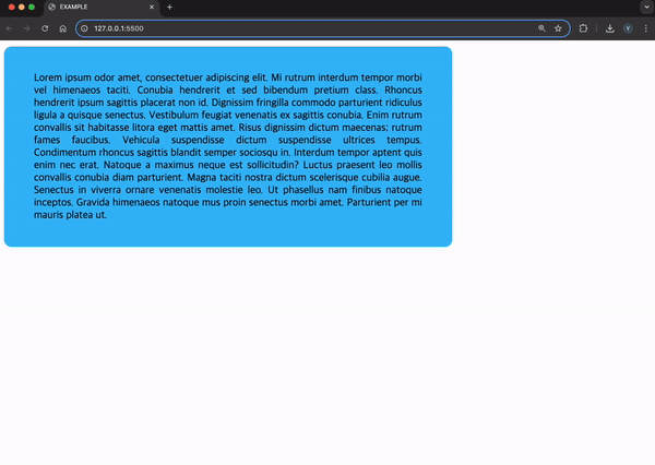 만약에 CSS까지 함께 사용한다면 좀 더 쉽게 여러 요소를 반응형으로 처리할 수 있다. 예를 들어, div 요소의 크기를 뷰포트 width 사이즈 기준 퍼센티지(%)로 적용하면 뷰포트 사이즈의 변경에 맞게 자동으로 요소의 크기가 변경되는 게 확인된다(div 태그 안에 있는 p 태그는 반응형으로 자동 줄 바꿈이 되기 때문에 박스 영역을 벗어나지 않고 함께 반응형 처리가 잘 이루어진다).