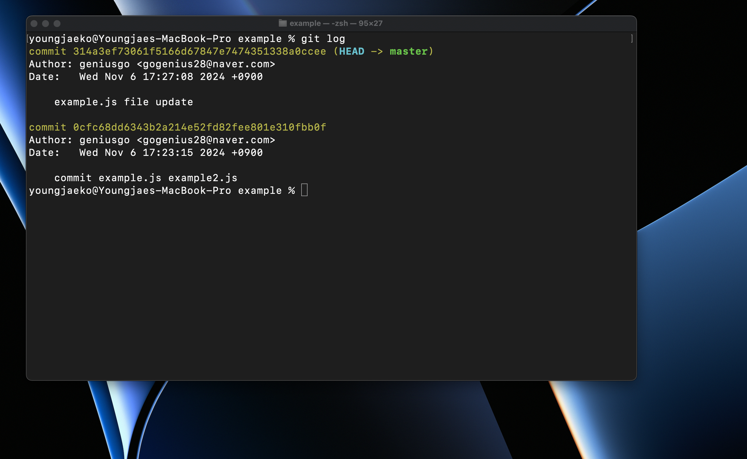git log 명령어를 사용하면 그동안 해온 커밋 이력을 확인할 수 있다. 위에선 총 두 번의 커밋을 했었기 때문에 git log에는 두 개의 커밋 이력이 확인된다.