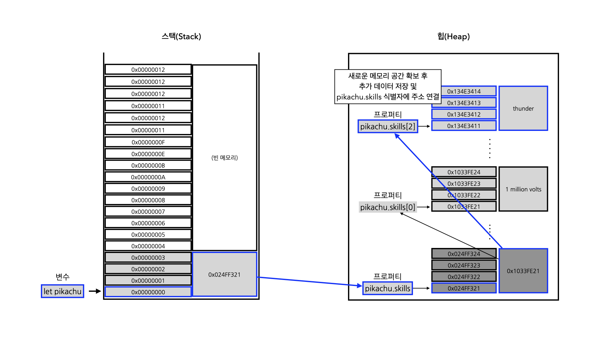원래 pikachu.skills는 길이가 2인 배열이었다. 하지만, 배열은 참조 데이터이고, 가변적이다. 식별자인 pikachu는 참조형 데이터이고, 원시 타입과 다르게 힙 공간 내에서 필요하다면 데이터의 변경을 가할 수 있기 때문에, thunder라는 값을 추가하면 식별자 pikachu.skills[2]에 해당하는 메모리 공간을 추가로 확보하여 값을 저장한다(참고로, pikachu.skills 또한 참조 타입이기 때문에 값으로 식별자 주소를 갖고, 인덱스에 값이 추가되거나 변경될 때마다 참조된 주소를 변경하며 값을 수정한다. 예를 들어 pikachu.skills[0]은 원시 타입이기 때문에, 만약에 해당 식별자에 값을 재할당하면 pikachu.skills에 연결된 참조가 새롭게 확보된 메모리 공간으로 변경되고, 재할당된 값이 그 공간에 저장될 거다. 그리고, pikachu.skills[0]은 Garbage collecting의 대상이 된다).