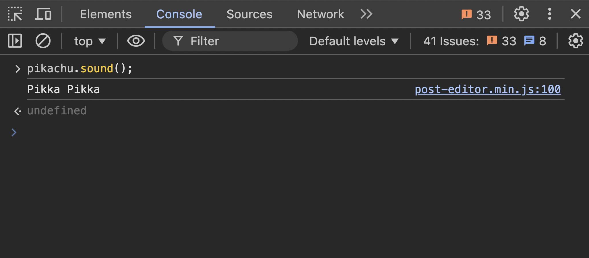 pikachu.sound(); // Pikka Pikka undefinedsound 프로퍼티에 할당된 익명 함수는 울음 소리를 콘솔에 출력만 하고 값을 리턴하지는 않는다. 그래서, 브라우저 콘솔에 pikachu.sound() 메서드를 실행하면 먼저 콘솔에 Pikka Pikka라는 울음소리가 출력되고, 그다음 undefined가 나오는 게 확인된다(리턴 값이 없는 함수는 표현식의 평가 결과로 undefined를 가진다).