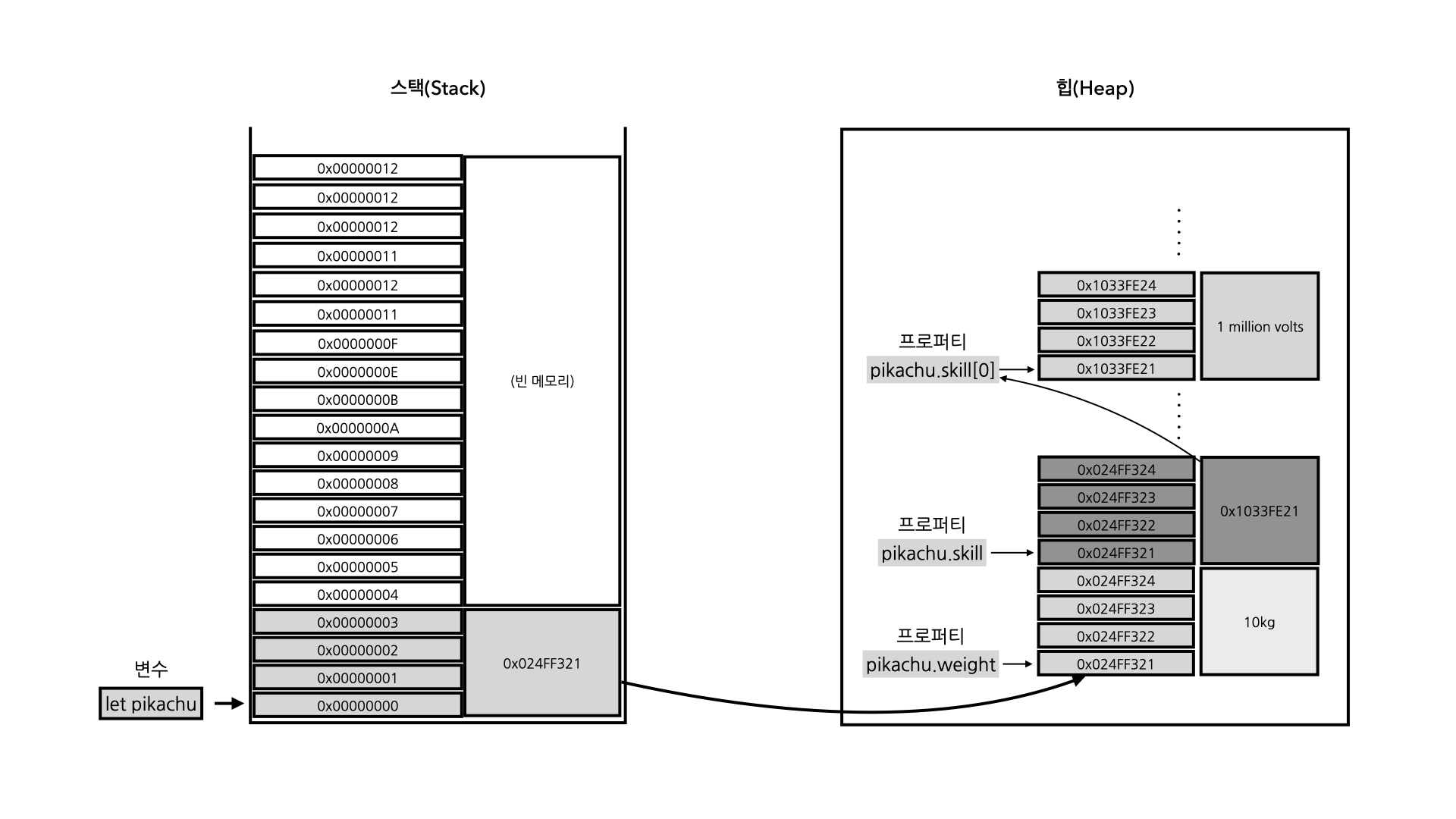변수 pikachu가 확보한 메모리 공간에는 pikachu 객체 데이터가 저장된 힙 메모리 공간 주소가 값으로 저장된다. 힙에서는 다시 각 프로퍼티들이 확보한 메모리 공간들이 있고(이미지에선 pikachu.weight 프로퍼티가 메모리 주소 0x024FF321을 가리키고 있다), 해당 메모리 공간에 원래 pikachu.weight 값인 6kg이 저장되어 있다. 해당 상황에서, 원시 타입인 pikachu.weight의 값을 재할당했기 때문에, 별도의 공간인 0x124432AB 메모리 주소를 확보하고 값을 새로 저장한다(기존에 값이 저장돼 있던 0x024FF321 주소의 공간은 Garbage Collecting의 대상이 된다). 참고로, 힙은 메모리 공간을 비선형적으로 할당하고 관리하기 때문에 가변적인 객체 데이터를 저장하고 관리하기 유리하다.