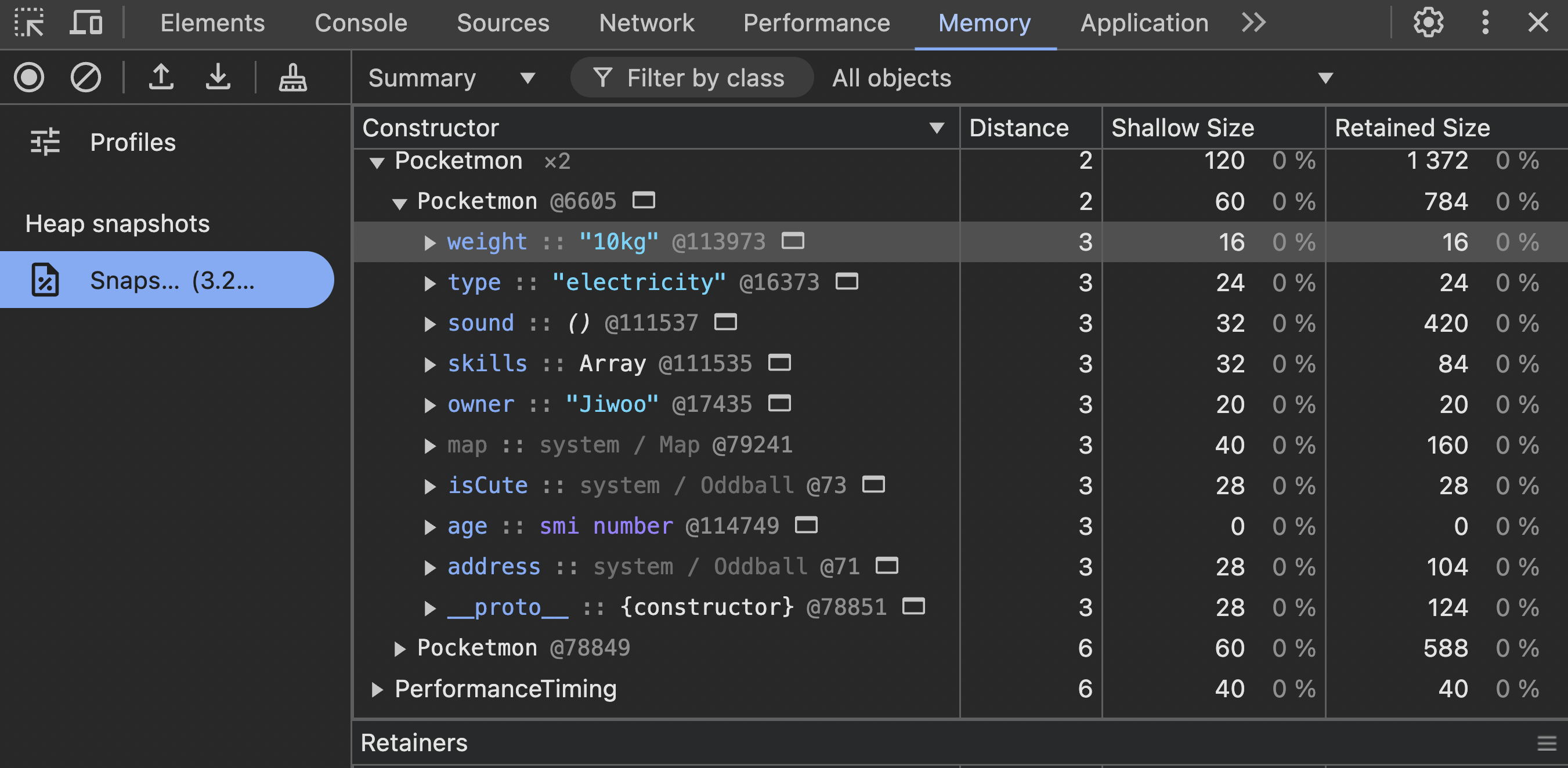 console.log(pikachu.weight); // 10kg변경한 후 메모리 주소를 확인해보니, pikachu 변수가 참조하는 힙 메모리 주소는 @6605로 동일하고, weight 프로퍼티가 가리키던 메모리 주소만 @15027에서 @113973으로 변경된 것이 확인됐다(weight를 제외한 나머지 프로퍼티 주소들도 역시 동일하다).
