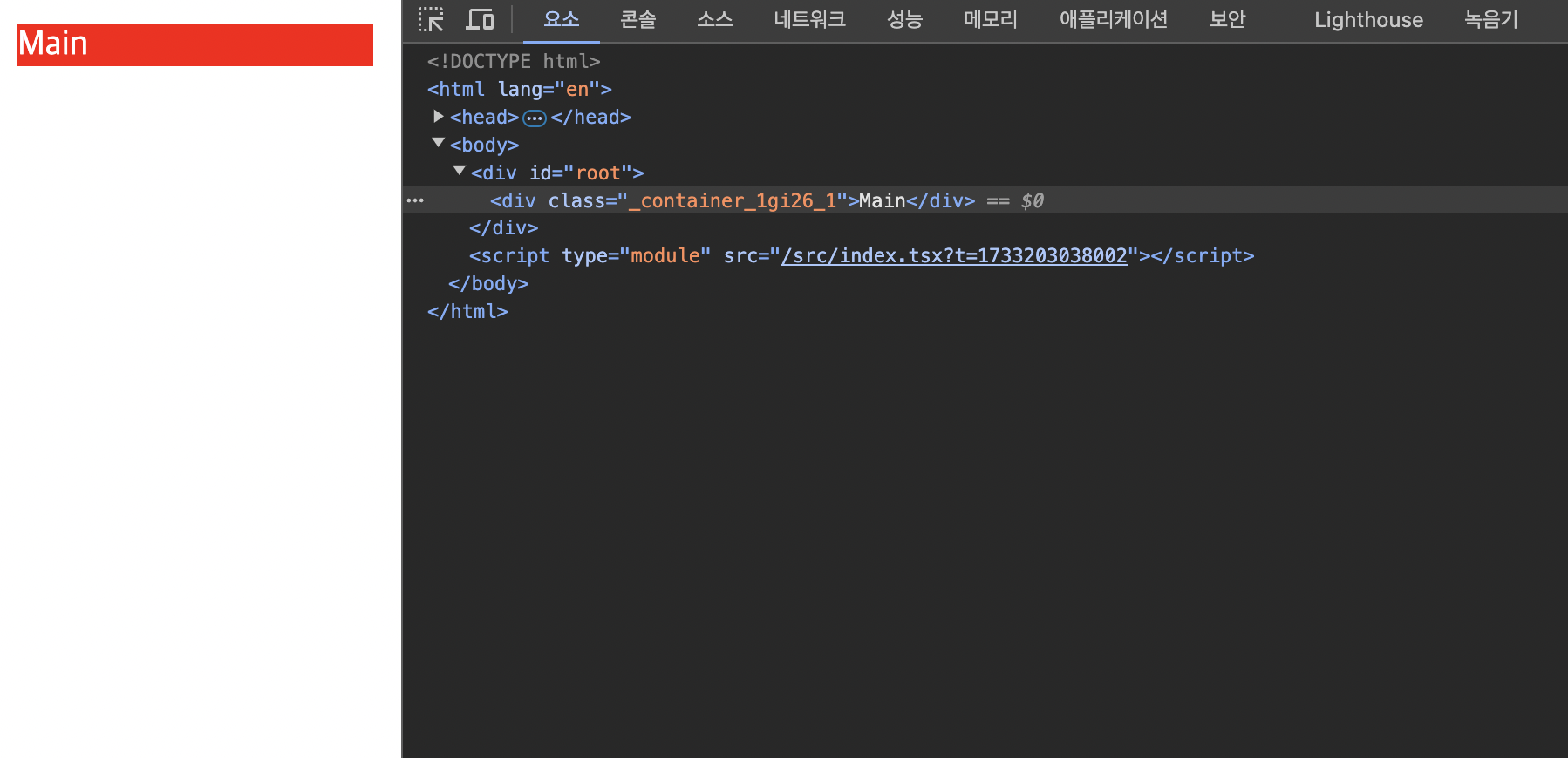 이렇게 클래스 명을 입력해 주면, 실제 렌더링된 화면을 확인해 보면 div.container 요소에는 div._container_1gi26_1와 같은 클래스명이 정의되어 있는 것이 확인된다.