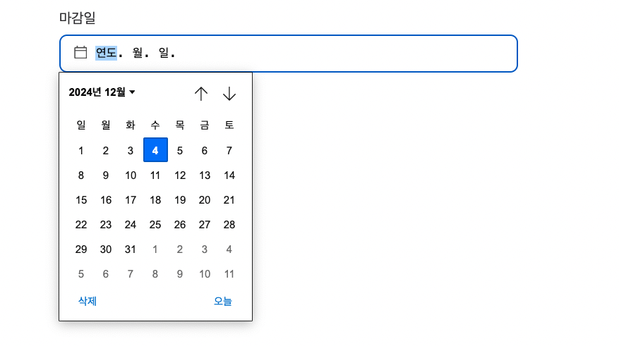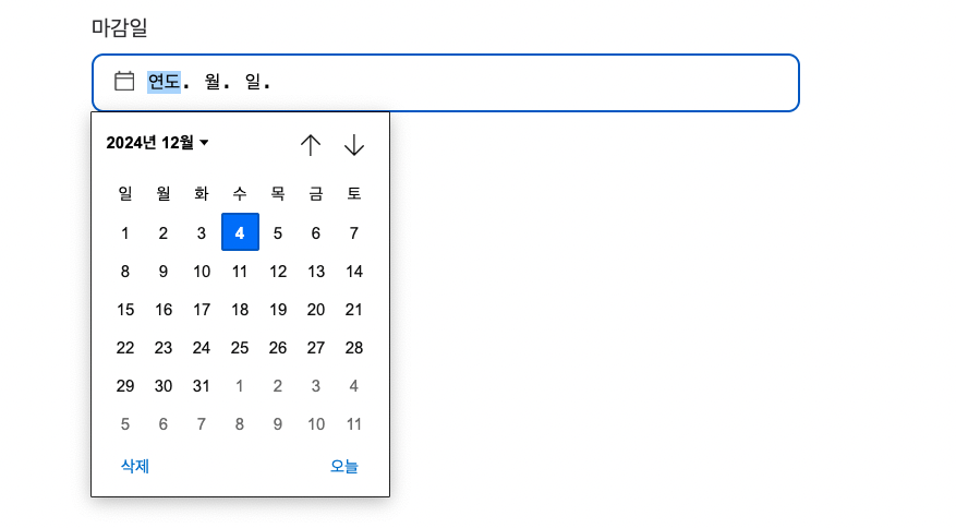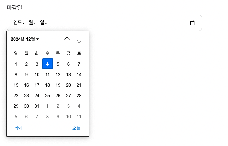 input[type='date']로 설정하면input텍스트 영역(날짜를 직접 입력하는 영역)에 '연도. 월. 일'이 기본 텍스트로 들어가 있었다. 그래서,placeholder로 원하는 텍스트를 넣어주는 게 어려웠다.- 브라우저에서 기본으로 제공하는 Date Picker Indicator는 원하는 모양으로 커스텀이 어려웠다.